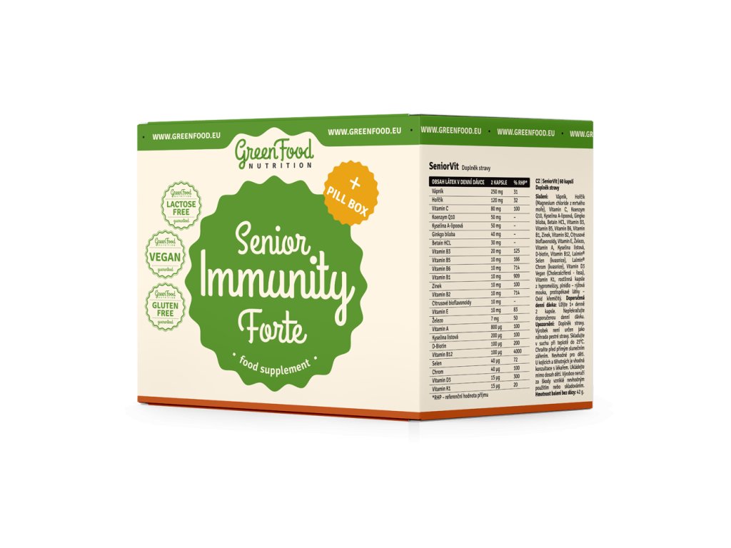 SeniorVit je komplexný výživový doplnok navrhnutý s ohľadom na potreby dospelej populácie. Obsahuje starostlivo vybrané zložky ako uhličitan vápenatý, horčík z Mŕtveho mora, vitamíny C, D3, E, A a K2VITAL®, koenzým Q10, železo, chróm a selén vo forme Lalmin®, a extrakt Ginkgo biloba 50:1. Táto kombinácia minerálov, vitamínov a rastlinných zložiek je obľúbená medzi ľuďmi zameranými na aktívny životný štýl, vitalitu a podporu celkovej pohody. SeniorVit je ideálnou voľbou pre každodenné doplnenie živín v období zrelosti aj aktívnej staroby.